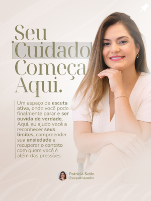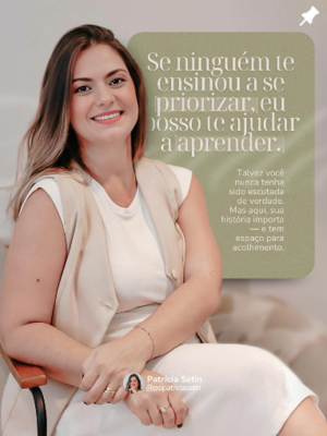 ou Patrícia Setin, psicóloga clínica há quase 10 anos, especializada em ajudar mulheres a lidar com a ansiedade e a baixa autoestima. Utilizo a abordagem da Gestalt-Terapia para promover autoconhecimento e transformação pessoal. Meu objetivo é oferecer um ambiente seguro e acolhedor, onde você possa explorar suas emoções e desenvolver estratégias eficazes para superar desafios pessoais e profissionais.